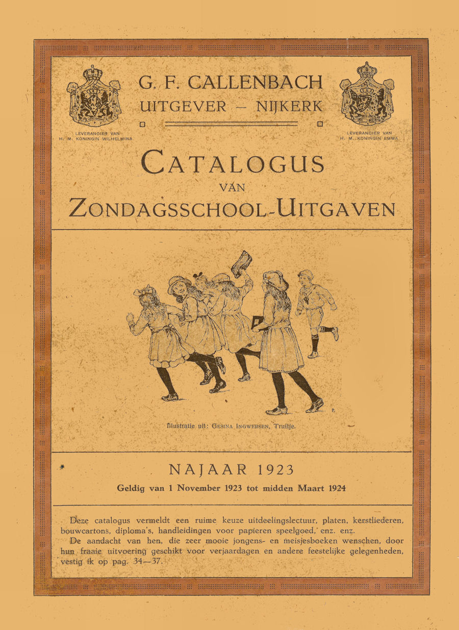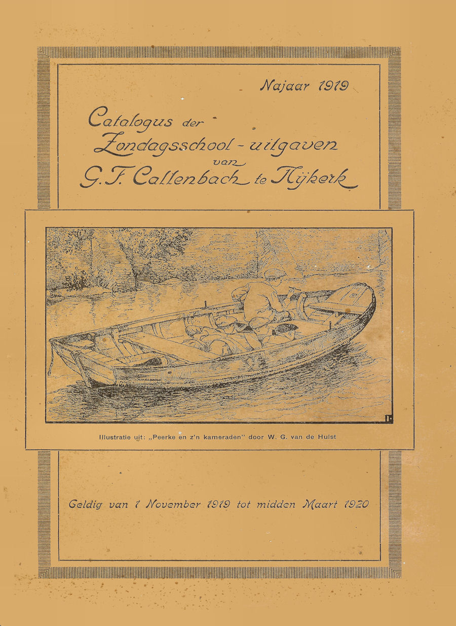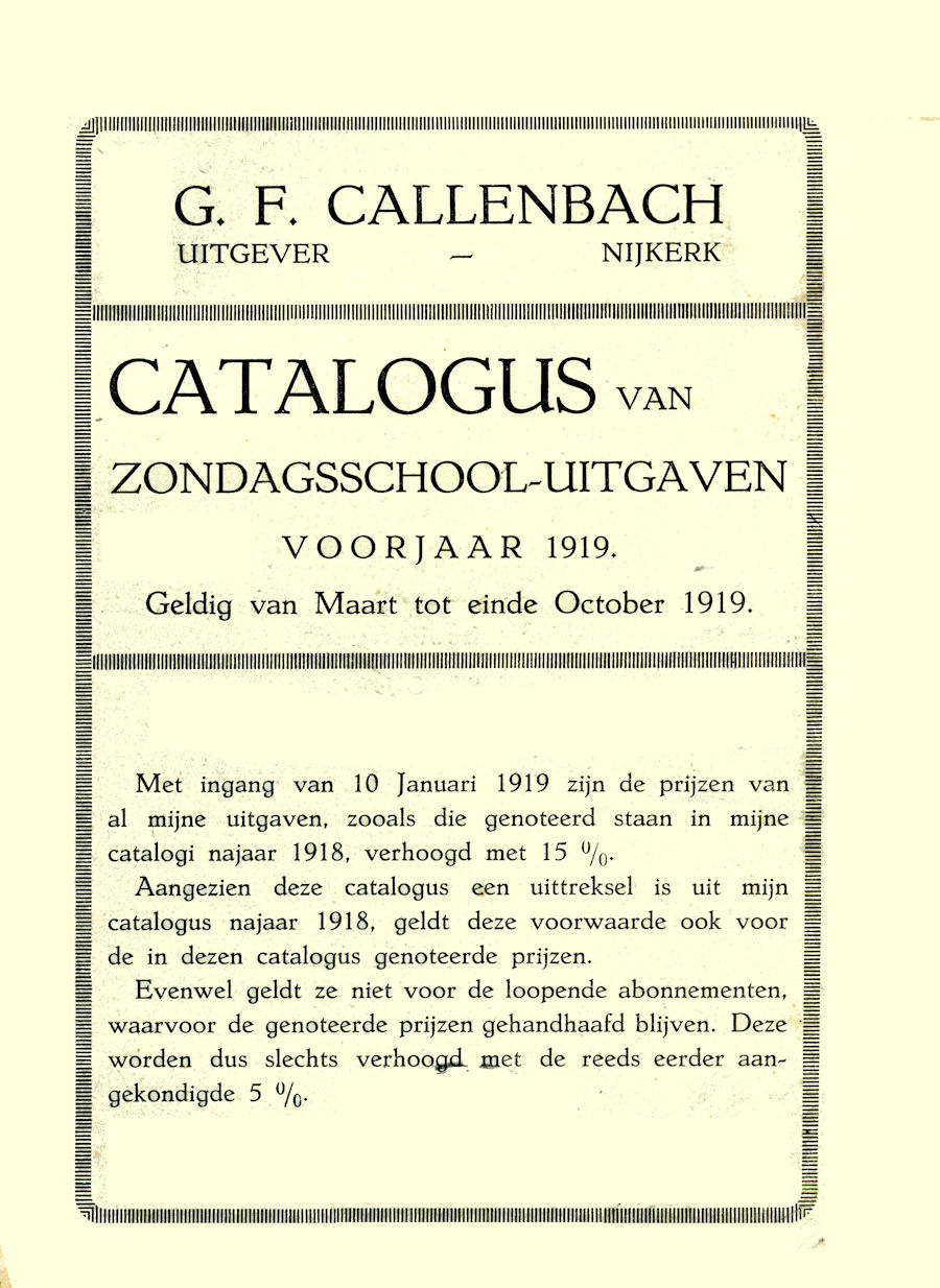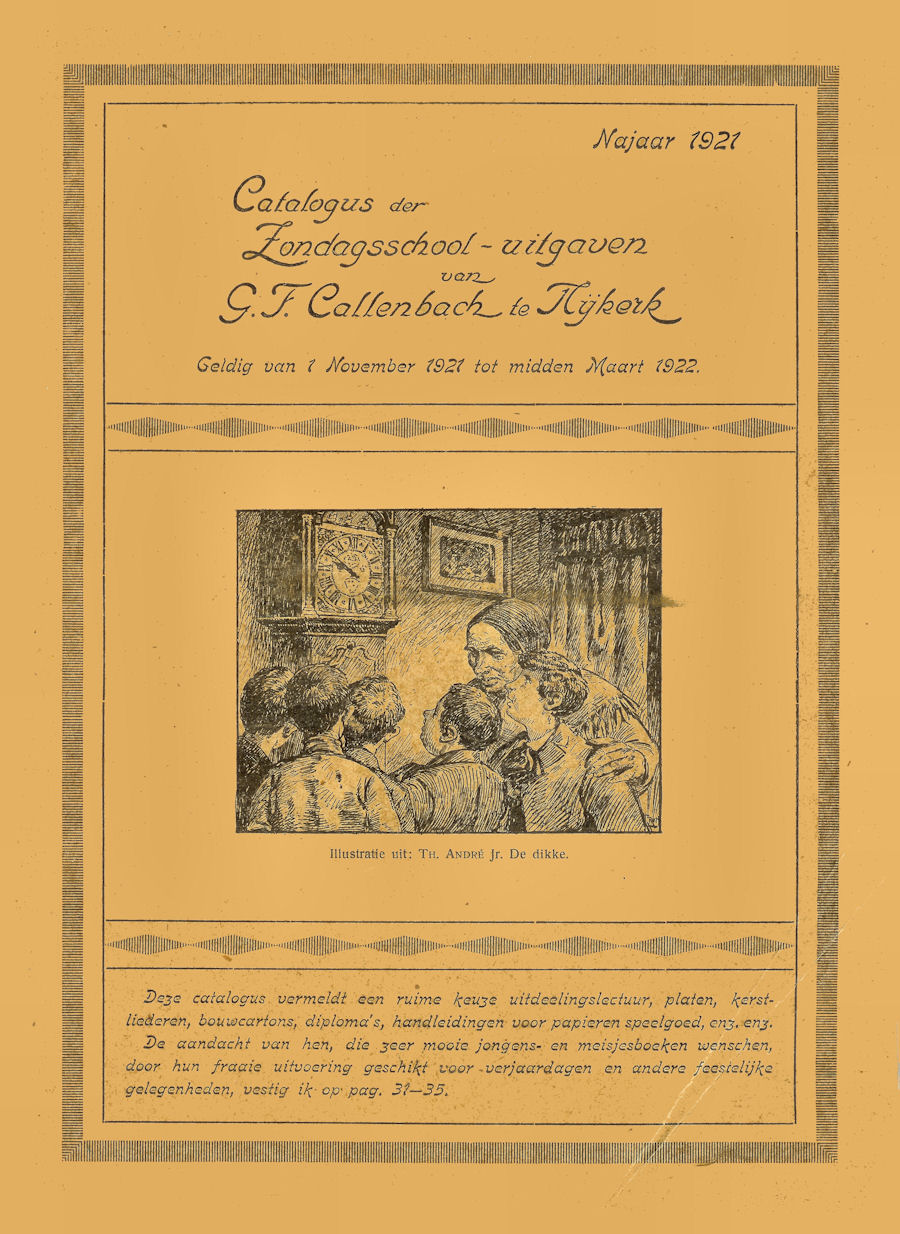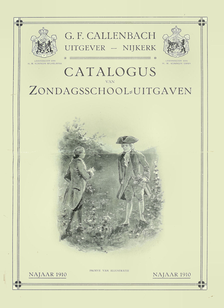 Van een aantal uitgevers van zondagsschoolboekjes, zoals Callenbach, Meinema, Milborn, Voorhoeve, zijn hier catalogi opgenomen. Ze vormen een bron van informatie over welke boeken er verschenen zijn en wanneer. Alle relevante informatie eruit is verwerkt op deze website. Bij het LM, het Letterkundig Museum, berust een groot deel van het archief van de uitgever Meinema, met name catalogi, brochures en originelen van illustraties. Ook bij het HDC, het Historisch DocumentatieCentrum aan de VU te Amsterdam berust een deel van het Meinema-archief waaronder ook catalogi. Door de welwillende medewerking van Stichting Oud Nijkerk zijn er een zeer groot aantal catalogi van uitgeverij Callenbach opgenomen kunnen worden.