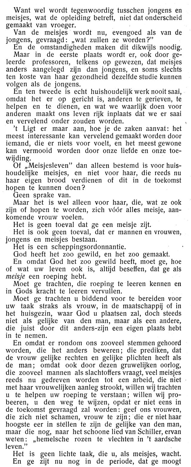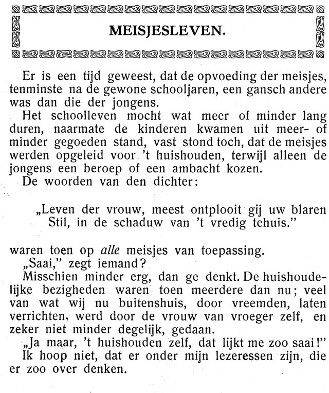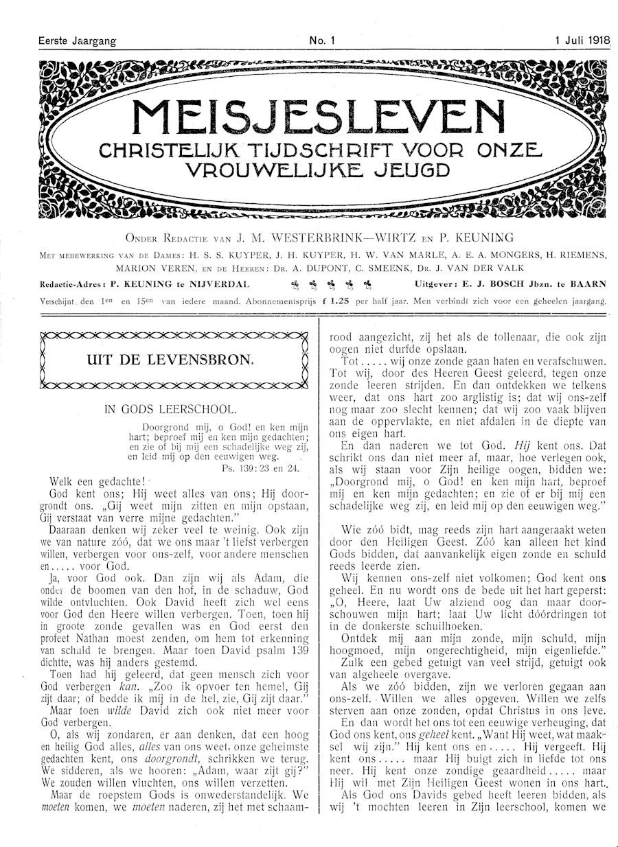 In juli 1918 verscheen het eerste nummer van het tijdschrift Meisjesleven : Christelijk Tijdschrift voor onze Vrouwelijke Jeugd, bij de uitgeverij E.J. Bosch Jbzn. te Baarn. Het tijdschrift stond onder redactie van J.M. Westerbrink-Wirtz en P. Keuning. Verdere medewerkers earen de dames H.S.S. Kuyper, J.H. Kuyper, H.W. van Marle, A.E.A. Mongers, H. Riemens, Marion Veren en de heren A. Dupont, C. Smeenk en J. van der Valk.